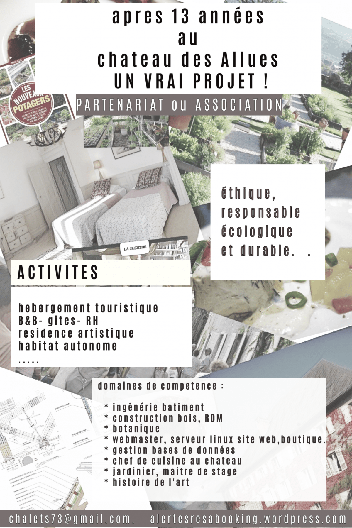 Treize années apres avoir posé mes valises et mes biens au chateau des Allues, treize annees à realiser les petits plats pour nos hotes, des centaines de milliers de plants et de repiquages, de cultures de legumes rares, 40 000 heures de travail, et dévouements a l’activité au service de e Stéphane Vandeville, que les surprises de la vie, orientent ma route vers un dernier vrai projet éthique, réaliste, constructif.